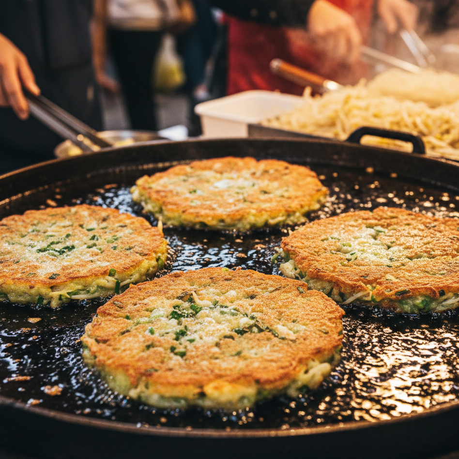 Similar to bindaetteok but often thinner and served in different variations. Some stalls add seafood or kimchi for extra flavor.