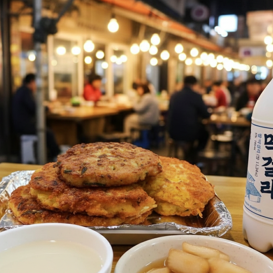My favorite way to enjoy the market is simple. Sit down at one of the old bindaetteok stalls, order a plate of crispy mung bean pancakes, and a bottle of makgeolli. Pour a cup of makgeolli first, take a sip, and then bite into the pancake — crispy on the outside, savory on the inside — dipped in soy sauce with pickled onions. That combination is perfection.