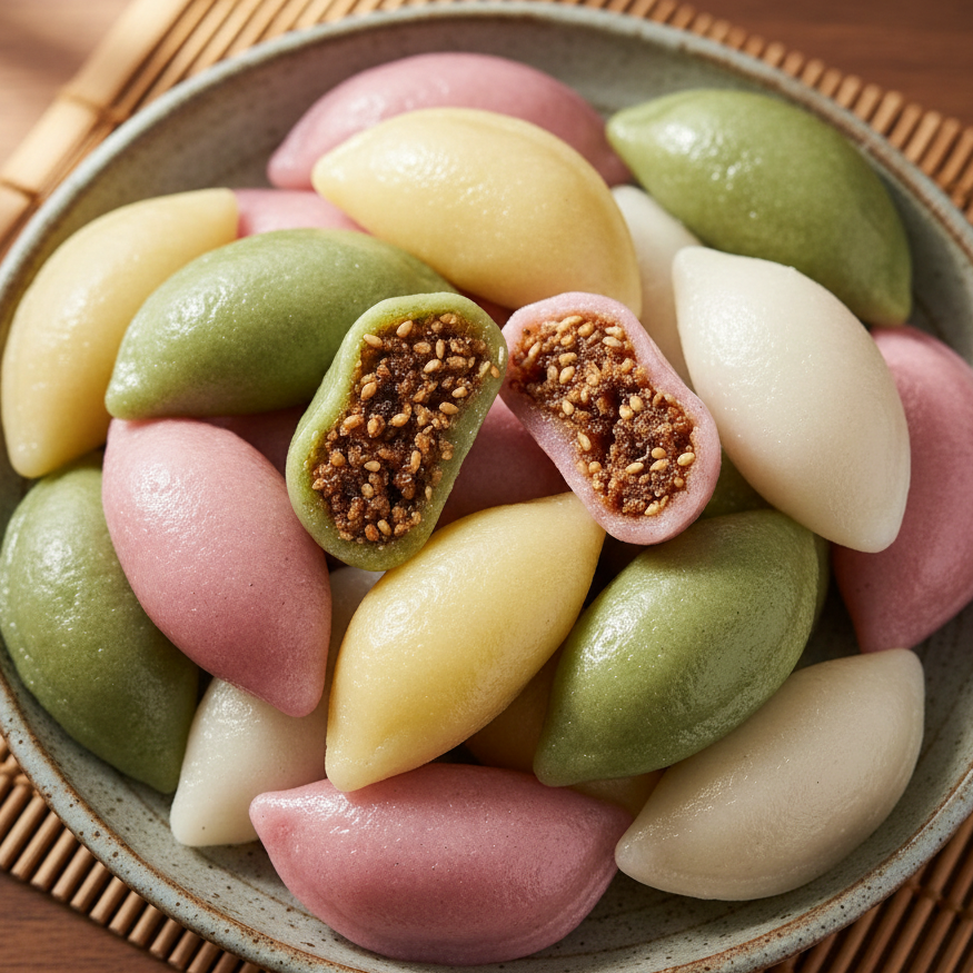 The iconic food of Chuseok is “songpyeon” (송편) — small, half-moon shaped rice cakes filled with sweet sesame, beans, or chestnuts. Families often make songpyeon together, and there’s a saying that if you make beautiful songpyeon, you’ll meet a beautiful spouse or have beautiful children.
