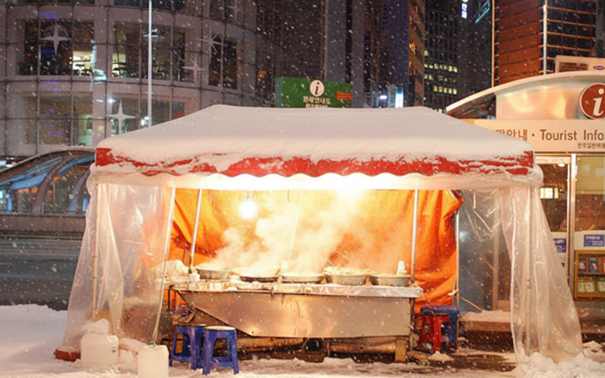 The memories I cherish most come from Korean winter nights. After finishing hagwon (after-school academy), I would walk toward the subway station to go home. The winter air was freezing, and my breath came out in white puffs. But there, right in front of the station, was a small pojangmacha — a street food stall with orange plastic tarps glowing warmly in the dark.